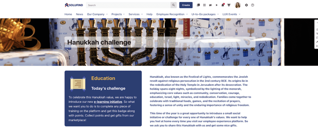 This time of the year is a great opportunity to introduce a small social initiative or challenge for every one of Hanukkah’s values. Of course, your employees will profit from these initiatives but you can make sure to motivate them properly. Suggest fun and easy challenges to let people learn more about Jewish heritage and Hanukkah values with each such initiative. For example, for the education value you can launch an e-learning initiative for your employees and challenge them to complete some training via this initiative. For every complete training, they will get a badge with points to exchange them for gifts, such as merch or gift certificates to a book store.