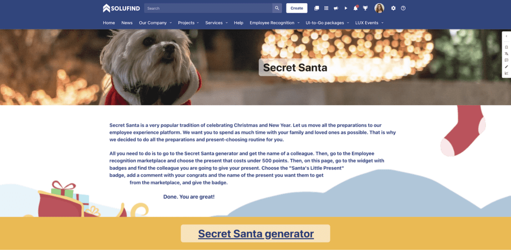 Secret Santa is a very popular tradition for companies that celebrate Christmas and New Year. You can move all the preparations to your employee experience platform. The main principle of this gift-giving game is to set up some budget and get a random colleague’s name to be their Santa.