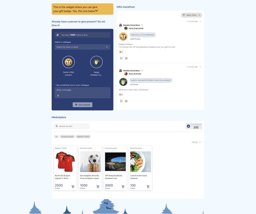 The advent calendar will be represented with a set of simple daily tasks to perform to get a badge for the activity. Collecting badges and points people will be able to exchange them for gifts in the employee recognition marketplace.